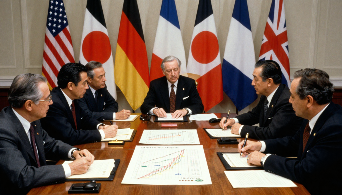 Hovoříme o Plaza dohodě, podepsané v září 1985 ministry financí a guvernéry centrálních bank pěti největších ekonomik. Jejím hlavním cílem bylo oslabení příliš silného dolaru USA.